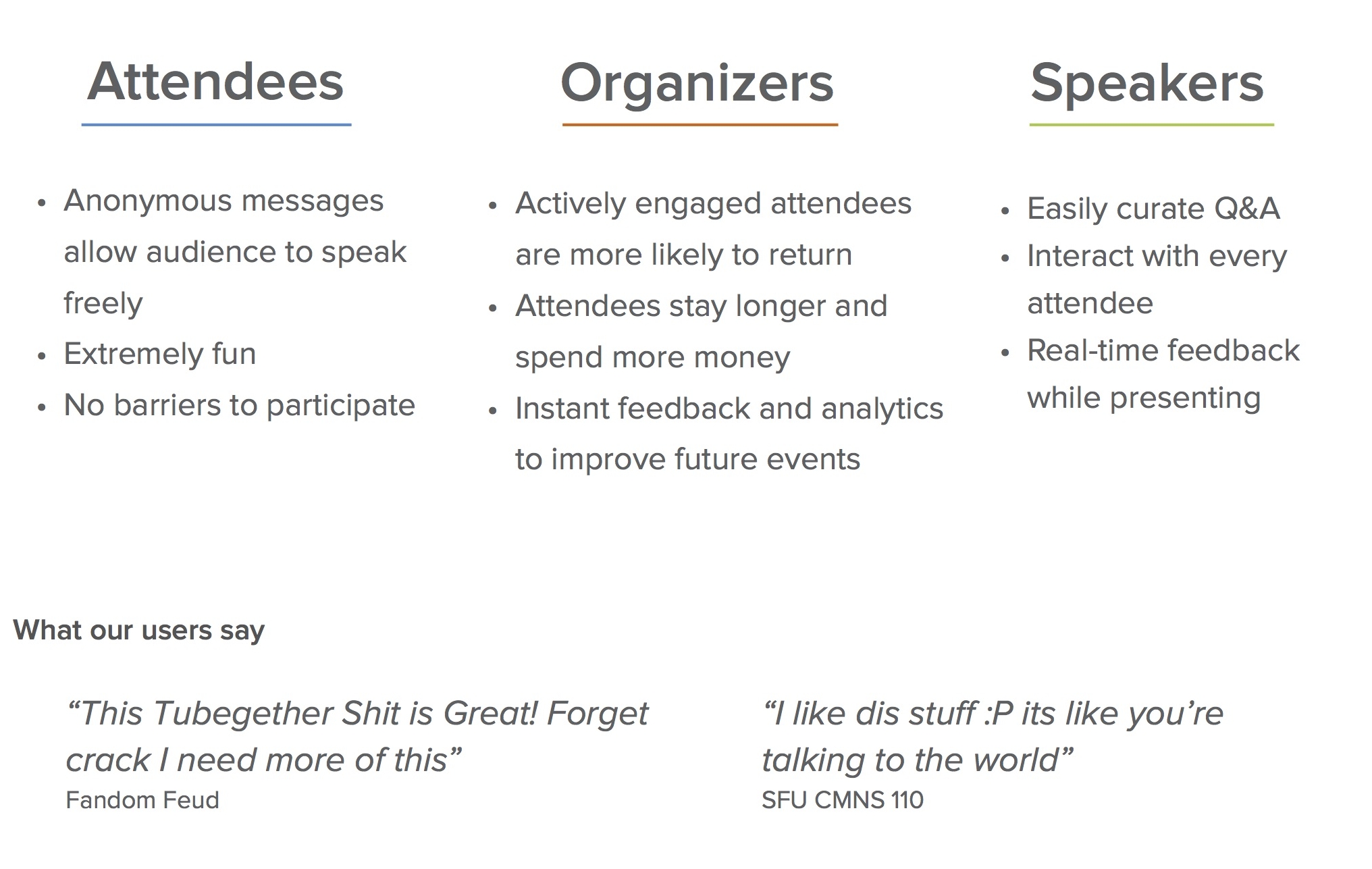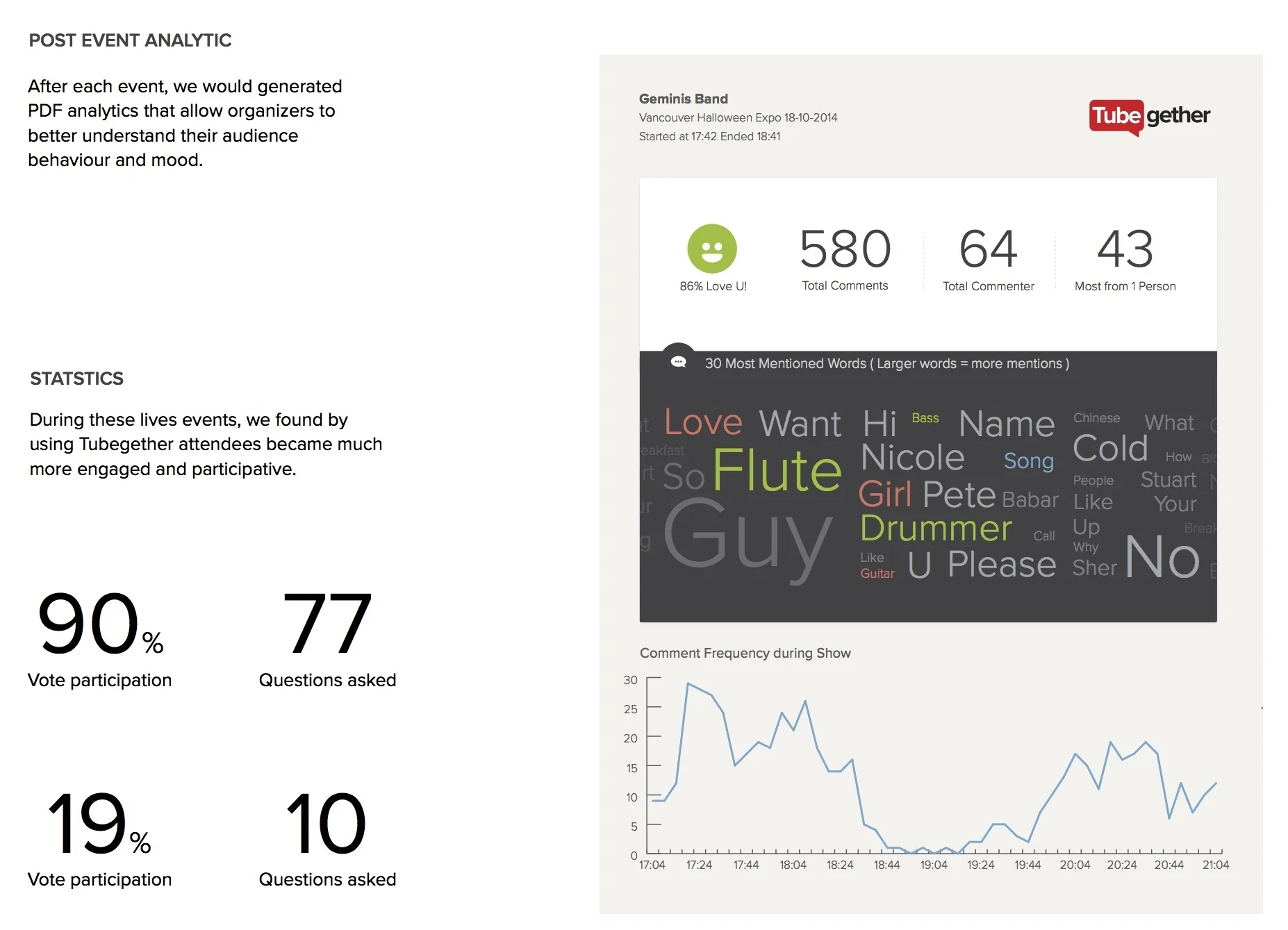 After attending many conferences myself, I found that attendees were often not fully engaged in an event. Therefore, I created Tubegether to make events more fun and interaction.